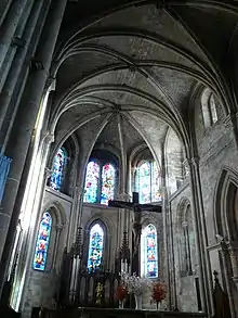 Le chœur est à deux travées terminé par une abside à cinq pans, et mélange le style roman et celui gothique. Le chevet possède deux séries de fenêtres superposées. Les fenêtres supérieurs sont géminées avec un arc légèrement brisé et s'inscrivent dans un ébrasement en forme de berceau cintré. Deux petites fenêtre de l'époque romaine éclairent la travée droite du chœur. Les voûtes sont à croisée d'ogives (six pour le rond-point et quatre pour chaque travée du chœur) supportées par des colonnettes[CA 31].