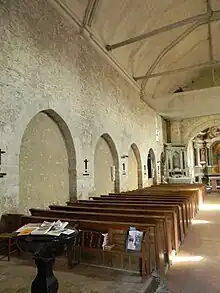 La grande nef (9,20 m de large, 24,20 m de long) est impressionnante. Le mur sud est renforcé de contreforts. Il subsiste trois petites fenêtres (0,90 m sur 0,30 m environ) ébrasées vers l'intérieur. À arcs fourrés et claveaux étroits elles semblent d'origine (XIe siècle) (Voir photo ci-contre) contrairement à un grand vitrail plus récent. Entre ces fenêtres étroites et évasées, pouvant servir à la défense, et le grand vitrail situé plus avant dans la nef, on peut placer la guerre de Cent Ans. En effet, la période plus calme qui suivit cette guerre s'avéra plus propice à des ouvertures favorisant la lumière. Ce mur comporte également une porte, murée à une époque inconnue. Elle correspond à cette tradition qui voulait que, dans certaines églises romanes, une porte latérale soit utilisée pour sortir le corps des défunts, après la cérémonie funéraire. (Porte des morts ou du Paradis).