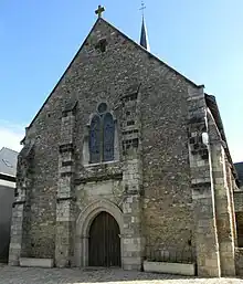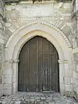 La façade est du XIIe siècle. Elle est soutenue par quatre contreforts massifs. Ils ne sont pas liaisonnés avec les murs ce qui indique qu’ils ont sans doute été construits après coup. En haut des contreforts, le glacis se termine sur un bandeau très élégant. Les teintes différentes des pierres sont le signe qu’elles ne provenaient pas d'une unique carrière mais étaient apportées par les habitants de la région, pendant la construction, au hasard des découvertes. Il y a également des pierres de réemploi, provenant de sarcophages mérovingiens extraits autour de la bâtisse. Le portail est à double rouleaux. Son arc de décharge est d’origine, contrairement au reste du portail, récemment restauré. La présence d'un mélange de lignes arrondies et de lignes droites indique un style romano-grec.