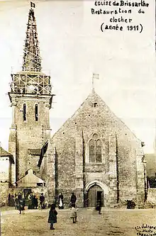 « Il fut, dit-on, bâti, par une demoiselle Amat, qui demeurait à la trinité, près le bourg. Cette demoiselle se chargea de faire l'avance des fonds nécessaires, moyennant que la paroisse lui donnerait la jouissance, pendant 25 ans, d'une prairie appelée les brouets, située près de la métairie de Tol, et dont les revenus, qui avant cette cession, étaient partagés par feu entre tous les habitants de Brissarthe. Après l'expiration de cette concession, lesdits revenus continuèrent d'être répartis comme auparavant. »