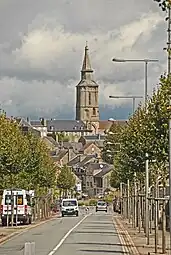 L'église s'impose sur la cité par son clocher haut de plus de 60 m.
