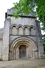Au XIIe siècle, sont ajoutés un portail d'inspiration saintongeaise et un clocher qui repose sur la deuxième travée en partant de l'est. Le portail s’inscrit dans une très large voussure à ressauts, couvertes d'une ornementation méplate ; au-dessus, une série de quatre arcades aveugles tient la largeur entre les contreforts d'angles ; plus haut, se trouve une corniche sur modillons.