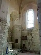 Comme à Glaignes, où le chœur n'était pas non plus flanqué de chapelles dès le départ, celles-ci se raccordent à la première travée du chœur par des arcades hautes et étroites, non moulurées, aux arêtes chanfreinées. Les arcades sont donc moins larges que la largeur disponible entre les colonnettes, et aussi moins larges que ne le sont les chapelles, ce qui indique que l'on a craint les frais d'une reprise en sous-œuvre, et percé les arcades dans les murs préexistants, en réappareillant simplement le pourtour des arcades. Procédant ainsi, le percement d'arcades plus larges aurait pu déstabiliser les voûtes du vaisseau central. La chapelle du sud est éclairée par une lancette simple en plein cintre, analogue à celles du chœur, mais les autres éléments de l'architecture sont différents. Les ogives sont monotoriques, en profil d'amande, et reçues sur des culots non sculptés dans les angles. Il n'y a pas de formerets à proprement parler, mais les murs du sud et de l'ouest s'apparentent à des arcades bouchées, et il y a donc, en lieu et place de formerets, un rang de claveaux qui retombe jusqu'au sol. À l'est, il a, légèrement désaxée vers le sud, la niche d'autel déjà signalée. Elle aussi éclairée par une baie en plein cintre, elle est recouverte d'une voûte en berceau brisé, et contient un autel de pierre datant d'origine. Une piscine liturgique en plein cintre est ménagée dans le mur à droite de la niche, et une série de quatre armoires murales superposées sont prises dans l'épaisseur du mur à gauche de la niche. Seulement la deuxième et la troisième armoire étaient pourvues d'huis ; les deux autres devaient être bouchées par des murs.