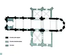 - À l'origine l'église avait un clocher au-dessus de la quatrième travée de la nef. De fortes colonnes accolées à des pilastres attestent cette première destination.