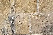 Ces gravures datent du XIIIe ou XIVe siècle. Parmi ces graffiti se trouvent plusieurs cadrans canoniaux et la gravure d'un cavalier. Les autres signes semblent dénués de sens.