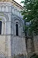 L'abside demi-circulaire, séparée du chœur par un arc posé sur deux colonnes à chapiteaux, plafonnée en cul-de-four est éclairée par cinq fenêtres en plein-cintre. Des colonnes montant du sol les séparent. La partie haute des colonnes est brisée en zigzag et elles semblent céder sous un poids qui les accable. Les colonnes sont terminées par des chapiteaux, sculptés de feuilles d'acanthe, sur lesquels viennent s'appuyer des arcs surbaissés. Chaque angle des fenêtres est garni d'une colonnette.