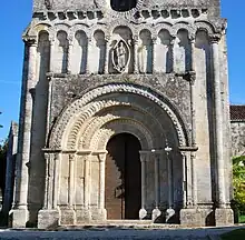 La façade conserve l’agencement du troisième quart du XIIe siècle, à l’exception de l’oculus et du clocher qui datent du XVe siècle. La rez-de-chaussée de la façade est occupé par un large portail à quatre voussures en plein-cintre ornées de motifs géométriques, de pointes de diamant, de fleurs stylisées, d'étoiles et d'éléments de feuillage.