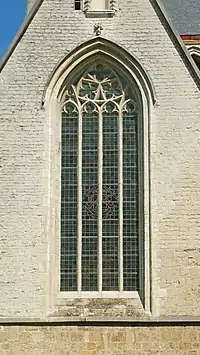 La façade du collatéral gauche est percée d'une haute fenêtre ogivale à encadrement mouluré comportant quatre lancettes et un remplage orné d'arcs trilobés, tandis que la baie qui orne le collatéral droit présente un encadrement chanfreiné[2] et un remplage orné de quatre-feuilles (quadrilobes). Le collatéral droit montre les traces d'une fenêtre ogivale murée.