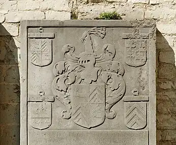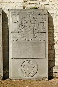 On peut encore apercevoir plusieurs pierres tombales en pierre bleue (petit granit) posées contre la façade sud. Certaines de ces dalles funéraires sont ornées d'un blason central composé d'un écu, d'un heaume, d'un cimier et de lambrequins, et de blasons plus petits disposés latéralement.
