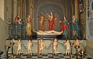Une petite chapelle latérale donnant sur le chœur latéral sud (chœur Saint-Quentin, Sint-Kwintenskoor) abrite une belle Déploration du Christ en bois polychrome, de style Renaissance tardive datant de 1618, avec dans le fond des peintures néo-gothiques de 1857[2].