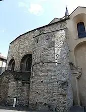L'église est orientée est-ouest. Le clocher octogonal à trois étages[1] surmonte côté sud la cinquième travée de la nef. Côté nord, la base symétrique de l'autre clocher a été conservée et la toiture à deux pans est recouverte de lauzes calcaires[3].