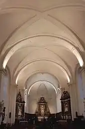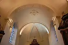 Une colombe du Saint-Esprit orne le plafond. L’abside est couverte d’une voute en cul-de-four à deux nervures décorées également de moulures en stuc.