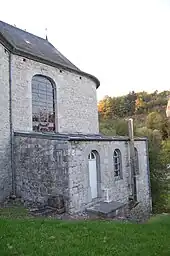 Le chœur est ajouré de deux baies de mêmes dimensions que celles de la nef. Sur la façade orientale, une porte sous un arc un plein cintre mène à la cave de l’église. Le chœur se prolonge dans une abside circulaire percée d’une fenêtre différente des autres baies rencontrées par sa petite taille.