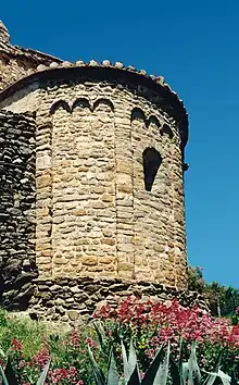 Cette abside présente une décoration de bandes lombardes composées de lésènes et d'arcades groupées par trois.