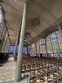 La légèreté des colonnes élancées et la lumière des grandes verrières aux variations chromatiques subtiles enserrées dans des claustras[14] définissent une esthétique nouvelle, empreinte d'un grand classicisme : le plan rectangulaire est divisé en trois vaisseaux (une nef centrale flanquée d'un collatéral de chaque côté), l'édifice adoptant ainsi une combinaison entre la formule du plan type d'une église-halle (vaisseaux de même hauteur) au plan basilical (collatéraux deux fois moins larges). Les collatéraux se prolongent au niveau du chœur par deux autels secondaires voués à Saint Joseph et à Saint François d'Assise. Quatre files de sept colonnes galbées et cannelées[15], de 11 m de haut sur 43 cm de diamètre (cette finesse des colonnes comparées à des « jambes de girafe » a valu à celle église d'être qualifiée d'architecture d'allumettes)[16], soutiennent de légères voûtes surbaissées (constituées de minces voiles de béton de 3 cm d’épaisseur, Perret comparait leur finesse à une « coquille d’œuf »), renforcées par des nervures qui évitent le recours à tout système de contrefort, au demeurant incommode en raison de la présence d'un mitoyen[17] ; les deux rangées périphériques sont détachées de la paroi afin d'accentuer l'impression de monumentalité. Le berceau longitudinal de la nef centrale (éclairée par des lustres polygonaux suspendus à la voûte) est contrebuté par les berceaux transversaux des collatéraux, chacun de ces éléments étant issu du même moule de coffrage que l'agence Perret avait déjà utilisé, peut-être à Montataire pour les ateliers Marinoni[18]. Le chœur surélevé et clôturé est encadré par deux escaliers qui mènent aux autels secondaires, de part et d'autre de la chapelle de la Vierge, tous trois placés face au mur du fond, incurvé en son centre. Pour rentabiliser l'espace, Perret crée sous le maître-autel (autel du chœur surmonté d’un ciborium à baldaquin) un niveau en rez-de-jardin abritant calorifère, sacristie, bureaux, magasin pour le matériel eucharistique, toilettes et salle de catéchisme[19].