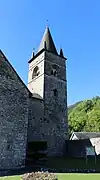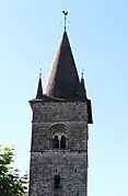 A l'ouest la tour carrée du clocher est haute de 35 m et est coiffée d’une flèche cantonnée de quatre clochetons en ardoise ouvert par des baies géminées.