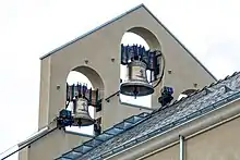 Le , les trois cloches, fondues par l'entreprise Paccard d'Annecy, ont été bénies par Mgr Tissier de Mallerais. La plus grosse est la Très Sainte Vierge Marie Immaculée (640 kg, sol), la deuxième est Saint Émilien (450 kg, la) et la troisième Saint Louis (330 kg, si)[4]. Deux statues sont placées dans les niches de la façade : saint Louis à gauche, saint Émilien à droite.