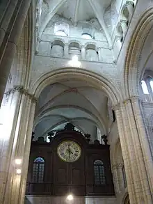 Dans le transept, les colonnes qui portaient l'arcade du XIe siècle sont noyées dans un mur relié à celui de l'extérieur à l'endroit de la poussée des voûtes et les croisillons du transept sont voûtés en voûtes d'arêtes à nervures. Dans la tour centrale, quatre colonnes sont ajoutées pour porter la voûte de la lanterne. Dans la travée de l'orgue, l'arc géminé est remplacé par un arc unique entouré d'une fresque crénelée. La tourelle de l'escalier du croisillon Nord du transept porte la portion octogonale du XIIe siècle sur la base carré primitive[8].