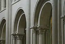 L'influence des constructions normandes et en particulier de Saint-Étienne est généralement admise. À ce développement, un contre-courant d'Angleterre vers la Normandie parait lui avoir succédé en particulier pour les chapiteaux cubiques juxtaposés présents à la cathédrale de Durham qui deviendront des chapiteaux à godrons[38] comme à l'abbaye Sainte-Trinité de Lessay.