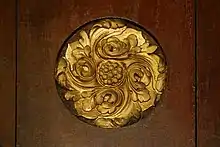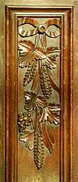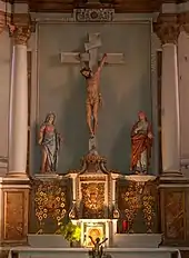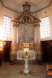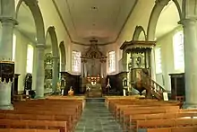 Le fond de la nef est orné de deux bancs en chêne du XVIIe siècle[P 9] (probablement les bancs de communion déplacés depuis le chœur lors de l'ajout d'un autel orienté vers les fidèles dans l'esprit du Concile Vatican II). Chaque section de ces bancs présente un cartouche encadré de gerbes de blé et de sarments de vigne et orné d'un motif comme l'agneau pascal ou l'Arche d'alliance.