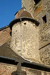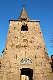Le noyau de la tour est probablement roman et date sans doute du XIIe siècle[2] : ses moellons de schiste apparaissent sur les deux tiers inférieurs des faces latérales de la tour[2]. Accolée à la face nord de la tour se trouve une élégante tourelle ronde renfermant l'escalier[P 6] qui mène au jubé[4], vestige de l'église romane[4], édifiée en moellons de grès blanc dont la couleur claire contraste avec le schiste sombre de la tour.