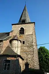 La tour est surmontée d'une flèche octogonale des XVIe et XVIIe siècles[2], couverte d'ardoises et percée de quatre lucarnes.