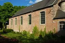 Le chevet est prolongé par une sacristie qui se trouve dans l'axe du chœur et présente les mêmes caractéristiques que l'ensemble de l'édifice : briques rouges, soubassement en blocs de grès et de pierre bleue, chaînages d'angle, fenêtres classiques encadrées de pierre bleue.