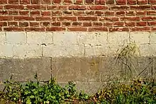![]() Le soubassement en pierre bleue et grès. |