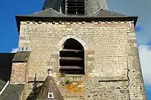 Le dernier étage de la tour fut construit à l'époque gothique : sa maçonnerie de grès assemblé en petit appareil apparaît encore à l'étage supérieur des faces latérales de la tour, percé de baies campanaires ogivales à abat-sons.