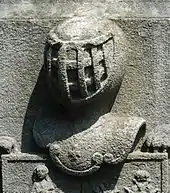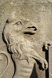 Le piédestal de ce monument est orné d'un blason flanqué d'un griffon (mi-aigle et mi-lion) et d'un lion, et surmonté d'un heaume[P 23].
