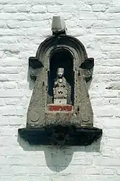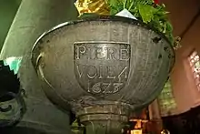 Cet ancien bénitier, qui porte maintenant une statue de la Vierge à l'Enfant, est frappé sur sa cuve d'un écu gravé Piere Voien 1623.