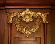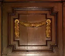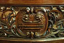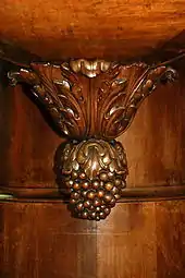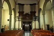 Le fond de la nef est occupé par la tribune d'orgues, ornée d'une balustrade en chêne et supportée par deux colonnes en chêne aux chapiteaux composites (combinaison de chapiteau ionique et de chapiteau corinthien).