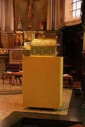 À gauche, au pied de la dernière colonne de la nef avant le chœur se dresse un ancien bénitier en pierre bleue de 112 cm de haut, « de même style que la cuve baptismale, mais mieux dessiné » selon Pilloy-Cortvriendt[P 9].