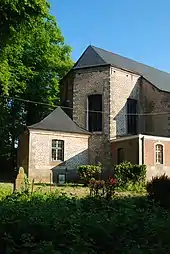 L'édifice se termine à l'est par un imposant chevet pentagonal mis en valeur par ses chaînages d'angle en pierre bleue.