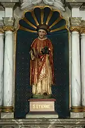 Sur la gauche du portail principal est enchâssée une dalle qui commémore la vie de Jacques-François Dusausoy[Notes 5] (1756-1824), curé de 1794 à 1824. Durant son service de trente ans, ce curé protégea notamment la châsse de saint Étienne de la destruction, transféra les reliques dans un nouveau coffre à la suite du pourrissement du premier durant son deuxième ensevelissement temporaire (entre 1794 et 1806) et rédigea sur parchemin le transfert des reliques.
