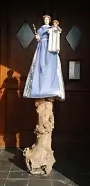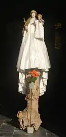 Portée jadis par un piédestal en bois orné d'une croix pattée, la statue de la Vierge est maintenant juchée sur un tronc d'arbre noueux très décoratif.