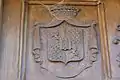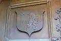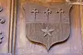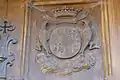 - Un blason écartelé au 1 et 4 à une croix alésée et; au 2 et 3 à l'aigle bicéphale. Ce blason est ovale. Il est possible que ce blason appartienne à la famille de la Béraudière[3]. Pour la représentation monochrome des armoiries (gravures, sculptures, etc) les couleurs sont représentées par des hachures de formes précises et conventionnelles selon la teinte. Les traits horizontaux sous les croix alésées sont la représentation de l'émail azur.