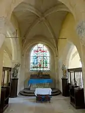 Dans trois angles de la deuxième travée, les ogives retombent directement jusqu'au sol. Dans l'angle nord-ouest, l'ogive est reçue sur un petit cul-de-lampe sculpté d'une tête humaine. Dans la première travée, toutes les ogives sont reçues sur des culs-de-lampe. Ceux du sud affichent des godrons, traités dans le goût de la Renaissance, et ceux du nord, des écussons. Dans l'angle nord-ouest, l'écusson est vierge ; dans l'angle nord-est, il est sculpté d'un croissant porté par deux ailes, et entouré de la devise en latin « Cœlum non soli » (le ciel n'est pas seul), qui, selon Léon Plancouard, un curé du XVIIe siècle aurait fait la sienne. La clé de voûte de la première travée a déjà été signalée ; elle arbore une écusson entouré d'une autre devise et la date de 1605. La clé de voûte de la deuxième travée n'est plus décorée, et les ogives s'y croisent simplement, mais deux quarts-de-cercle pourraient être les vestiges d'un décor sculpté détruit. En contradiction avec la datation de la chapelle du début du XVIIe siècle est la baie du chevet, qui est muni d'un remplage flamboyant. Il se compose de deux lancettes à têtes trilobées, qui sont surmontées d'un trilobe entre deux écoinçons ajourés. Une fois de plus, les commentaires de Léon Plancouard laissent perplexes : la chapelle serait « divisée en deux travées dont les retombées sont dissimulées par des pendentifs romans » (s'agit-il des culs-de-lampe signalés) ; « les piliers de forme cylindrique sont cantonnés d'autres colonnes » ; elle « reçoit la lumière par deux fenêtres dont l'une dans le style du XIIIe siècle ne doit cependant dater que du XVIe ; elle a été à ce moment ouverte pour les besoins de la cause, mais, comme la chapelle elle-même, elle n'est pas de la bonne époque »[27]. Aujourd'hui, il y a trois fenêtres, toutes en arc brisé, dont celles du sud sont dépourvues de remplage.