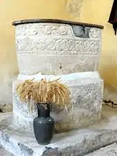 Parmi le mobilier de l'église, un seul élément est classé monument historique au titre objet par arrêté du , en l'occurrence les fonts baptismaux du XIIe siècle[31]. Louis Régnier suppose qu'ils sont contemporains du clocher et de la nef. Ils se composent d'une cuve baptismale à infusion de plan oblong, qui repose directement sur un socle de la même forme, mais de dimensions un peu supérieures. La différence de diamètre est rachetée par un chanfrein. Une grande dalle de pierre calcaire formant une petite estrade entoure le socle. La cuve est la seule partie présentant un intérêt artistique. Elle est ornée de deux frises. La première est constituée d'une ligne ondulée, qui se faufile entre des feuilles arrondies, reliée à la ligne par de courtes tiges. La deuxième frise est une guirlande de palmettes alternativement droites et renversées, à la base de laquelle règne une rangée de petites feuilles ouvertes. La bordure n'est pas moulurée. Dans leur ensemble, les fonts baptismaux mesurent 95 cm de hauteur, 85 cm de longueur et 55 cm de largeur. Ils avaient été recouverts de plusieurs couches d'un enduit jaune[8], que l'on est parvenu à enlever lors d'une restauration.