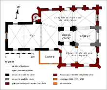 | Autres campagnes de travaux | milieu - 2e moitié XVIe siècle (voûtement nef et revoûtement chœur) ; 1587 (chapelle latérale nord) ; 1604 (chapelle latérale sud) | ||