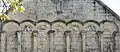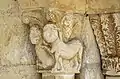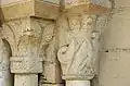 - Le premier niveau est constitué d’un portail et de deux arcades aveugles. Les chapiteaux sont classiques de cette époque : animaux, palmettes, feuilles d’eau, etc.