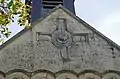 - Le troisième étage est constitué d’une croix avec au milieu, l’agneau pascal surmonté d’une croix, agenouillé, la tête à droite et retournée comme à Avord et Vornay, villages très proches de Jussy-Champagne.