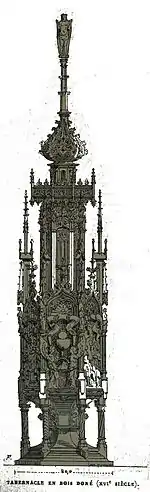 Une tour eucharistique gothique en bois doré et peint avec cinq scènes : saint André, Moïse (2 fois), saint Christophe, 2 anges présentant 1 calice[9].
