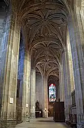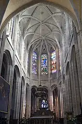 Face à ce manque de raffinement et d'originalité déjà rencontré dans la nef, le vaisseau central du chœur se remarque par son harmonie et son élégance. L'étage des fenêtres hautes atteint ici une hauteur proche de celle des grandes arcades, le seuil des fenêtres se situe à peu de distance au-dessus des grandes arcades de façon à éviter des murs hauts nus, et les fenêtres occupent tout l'espace compris entre les piliers prismatiques. Celles des travées droites sont, bien entendu, beaucoup plus larges que celles de l'abside, et un long glacis se situe en dessous des baies de l'abside, jusqu'à un bandeau courant tout autour du chœur horizontalement, moyen de souligner l'impression de verticalité. L'abside est voûtée séparément, avec des liernes et tiercerons, comme fréquemment à l'époque flamboyante. Une solution originale a été appliquée dans les trois travées droites, couvertes comme deux voûtes sexpartites superposées, avec des clés de voûte au sommet des doubleaux et des ogives qui ne se croisent pas au milieu de chacune des voûtes, mais à ces clés de voûte ainsi qu'à mi-chemin entre ces dernières et les points de départ. Les nervures prismatiques correspondent stylistiquement aux supports fasciculés, et il s'avère favorable pour l'esthétique du chœur d'avoir été conçu entièrement pendant une même époque[15].