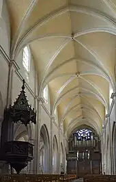 L'intérieur de l'église paraît d'une grande homogénéité stylistique et appartient en majeure partie au style gothique flamboyant, sauf les deux dernières travées de la nef et du transept qui conservent des traces du XIIIe siècle. Les fenêtres laissent également apparaître une certaine diversité stylistique et traduisent ainsi l'histoire de l'édifice. Par contre, la corniche fortement saillant le long des murs hauts de la nef, évoquant une esquisse d'entablement et donc le style de la Renaissance, est en plâtre et tout à fait moderne. Une caractéristique commune à toutes les parties flamboyantes de l'église est l'absence de chapiteaux. Les nervures des voûtes sont pénétrantes et se fondent dans les supports fasciculés. Dans la nef et les bas-côtés, toutes les voûtes sont des croisées d'ogives simples en arc brisé, et les grandes arcades sont également en arc brisé. Les voûtes des cinquième et sixième travées ont été refaite à la même période que les autres, à la période flamboyante. Dans le chœur, ses collatéraux et le déambulatoire, les arcades et voûtes sont en cintre surbaissé[15].