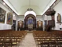Construit à partir de 1809 en réutilisant des structures du XVIIe siècle, et ouvert au culte en 1812, l'édifice est inscrit comme monument historique français en 2006 ; six des tableaux qu'il renferme sont des objets protégés répertoriés dans la base Palissy.