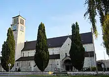 L'église, dont la structure est en béton armé, se présente sous la forme d'une basilique médiévale néo-romane à trois nefs et orientée. Elle comprend un transept. Elle est revêtue de dalles de calcaire d'Ebenwieser (près de Ratisbonne). La longueur totale est de 70 mètres, la largeur de 25 mètres, la hauteur de la nef centrale est de 24 mètres et la tour mesure 49 mètres de haut[3].