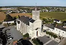 L'église Saint-Aubin est construite durant les années 1840, pour remplacer celle du vieux bourg, trop petite[2], qui sera démolie[réf. nécessaire]. Construite sur le bord de la Loire, derrière une digue qui forme une place à cet endroit, elle repose sur un sol instable remblayé, constitué d'ardoises, de tuffeau et de sable[2]. Dix ans après sa construction, l'édifice nécessite de descendre le chœur et la nef de 8 mètres en raison de problèmes d'instabilité[2]. Des étais sont également construits pour renforcer les façades latérales et la charpente est aussi renforcée[2].