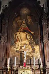 Sur la droite de l'entrée, une inscription indique les affres de la révolution française qu'ont subis les Mouscronnois et son église en 1794. Au fond à gauche, une petite chapelle est dédiée à l'adoration du Saint-Sacrement. Devant les rangs de chaises destinés aux fidèles, se trouve un autel moderne généralement recouvert d'une toile simple. L'autel utilisé avant la réforme liturgique du concile Vatican-II est caché juste derrière l'orgue. Deux tableaux de grandes dimensions du peintre courtraisien Liévin François Vermote (fils de Séraphin Vermote (nl)), peints en 1859, se trouvent sur les côtés de l’autel, l’un à gauche, « Pietà » (3,40 × 1,53 m)[3], l’autre à droite, « Martyre de Saint Barthélémy » (3,40 × 1,50 m)[4].