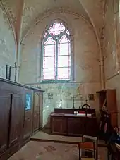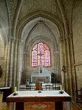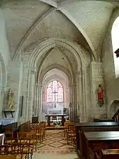 Le chœur a la même hauteur que la nef, mais est moins large, ce qui lui confère des proportions plus élancées. Il s'ouvre, depuis la nef, par un arc triomphal à double rouleau, en arc brisé, dont l'intrados est mouluré d'un méplat entre deux tores, et le rang de claveaux supérieur, d'un tore de chaque côté. Il retombe, de chaque côté, sur les hauts tailloirs carrés d'une colonne engagée et de deux fines colonnettes logées dans des angles rentrants. Leur profil se compose seulement d'une fine tablette et d'un très large cavet. Ce choix d'un profil très simple a apparemment été retenu pour être compatible avec la présence d'un décor sculpté, que le large cavet accueille sur cinq des sept tailloirs au sud du doubleau intermédiaire. Côté nef, le profil des tailloirs se continue latéralement jusqu'aux angles. La sculpture extrêmement fouillée des corbeilles des chapiteaux contraste avec la nudité de la plupart des tailloirs. Elle est caractérisée, selon Dominique Vermand, « par l'ample mouvement de forts tiges se terminant en palmettes ». L'on trouve aussi des feuilles d'eau étagées sur deux rangs, qui peuvent être plates ou s'enrouler aux extrémités, et des feuilles d'acanthe en plusieurs déclinaisons. Au sud, les angles du gros chapiteau sont flanqués de têtes de monstre associées à des jougs. Le chapiteau de l'ogive affiche également une tête de monstre à son angle. Les fûts sont appareillés. Leurs bases sont, pour la plupart, mutilées, mais semblent se composer d'un tore supérieur, d'une large scotie, et d'un épais tore inférieur qui ne déborde presque pas[5].